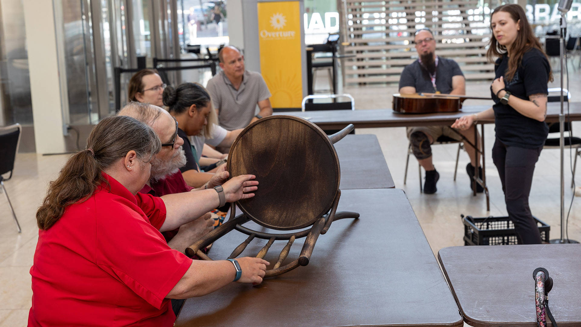 Guests got to touch a wooden chair, scarf, blanket, bell, shaker and beads as well as a radio, microphones, beaded dress and wigs. Guitarist Mike Wilson told guests about the 11-member orchestra and passed around his guitar, letting guests strum a few chords.