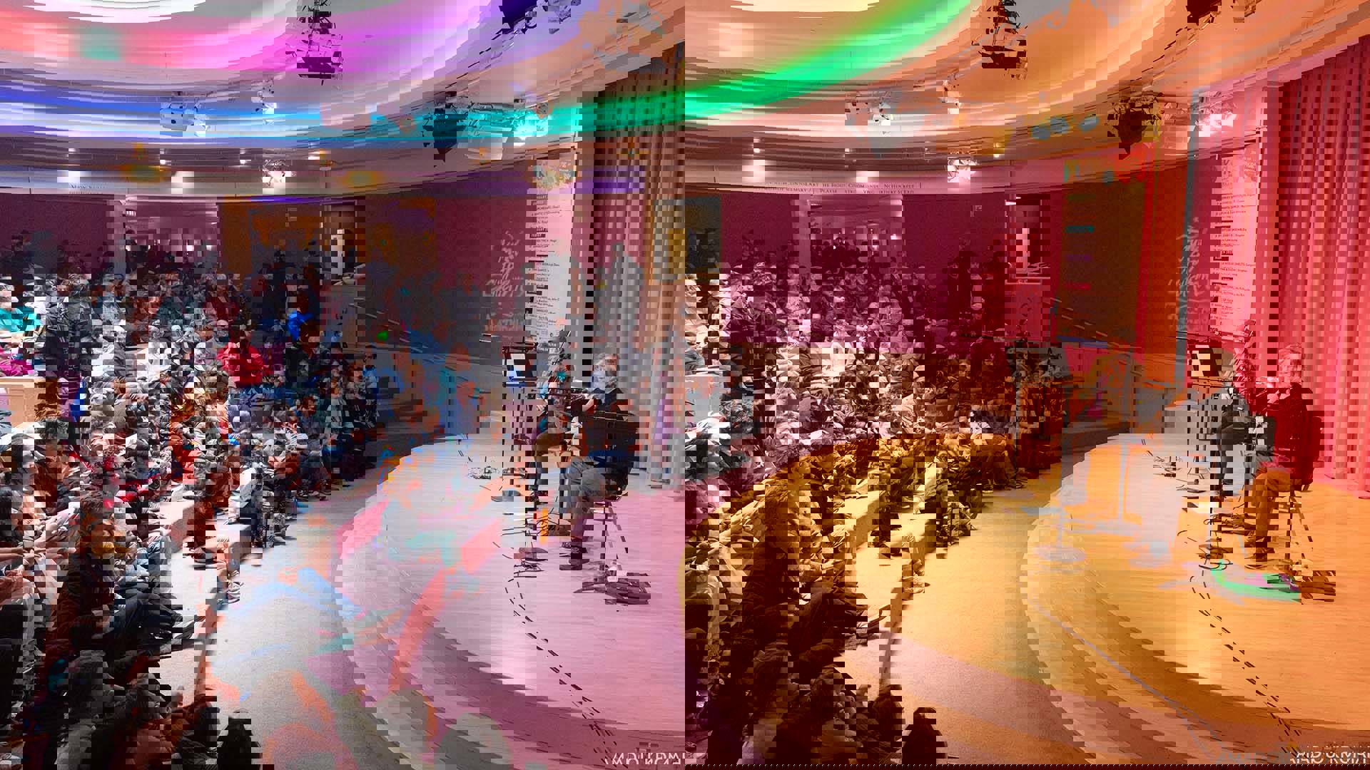 The Rotunda Stage is an indoor amphitheater with circular bench seating surrounding an elevated thrust stage. Located directly below Overture Center’s signature oculus, the stage is partially open to the main lobby and floors above. Its colorful walls and casual seating make the Rotunda Stage a perfect space for community events, children’s programs, music recitals and more.