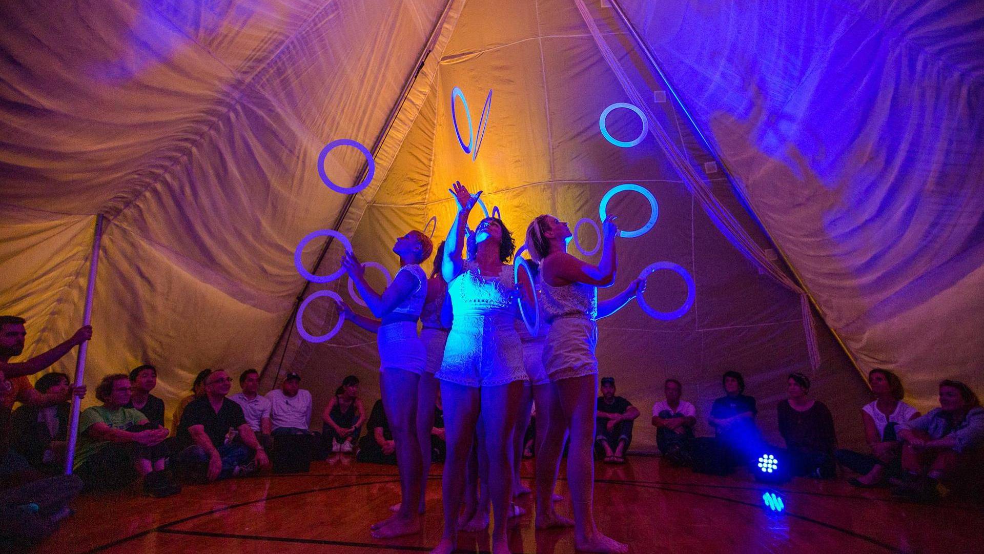 Immerse yourself in an enchanting circus adventure within a cozy tent. Witness a world of wonder unfold from a simple fabric puddle as an all-female troupe of bold acrobats captivates you with mesmerizing juggling, Cyr wheel spins, breathtaking duo trapeze acts, unique rope performances, and awe-inspiring feats of balance and strength. Trust is key in this limited 100-person experience as audience and performers co-create the show. Be prepared to sit, stand and roam in this interactive spectacle, where community and wonder merge for a fleeting, magical moment.